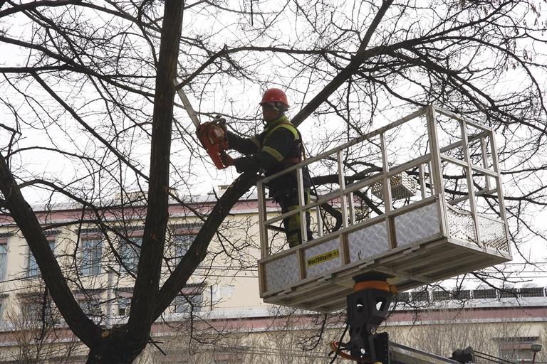 工作人员细致地为树木修剪枝条。记者 余书冉 摄