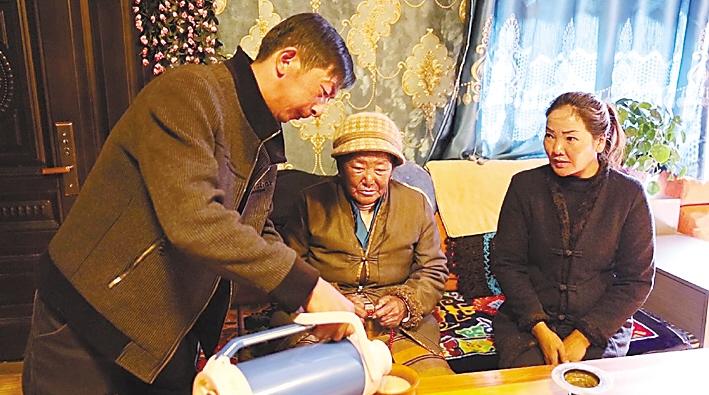 任拥军给岳母倒茶。本报记者 刘枫 王珊 谢筱纯 本报通讯员 嘎玛益西 白玛永青