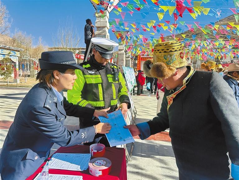 图②:在纪念西藏民主改革66周年活动上,康马县公安局民警向群众宣传防范电信诈骗知识。
