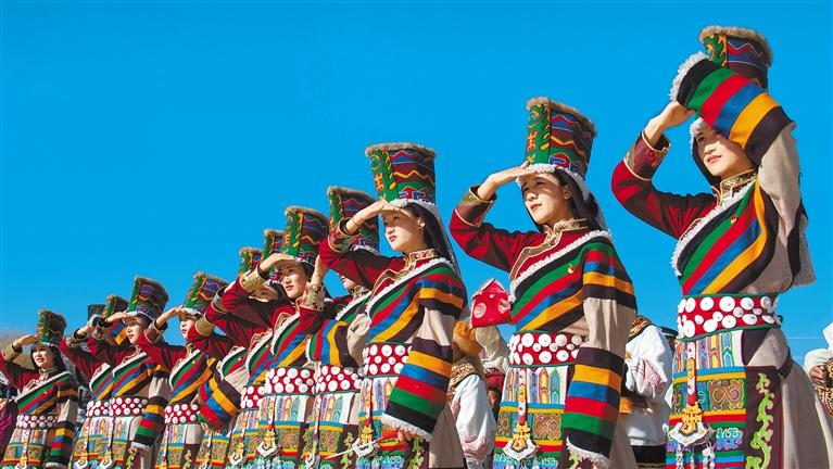 图③:日喀则市群众性广场舞(锅庄)展演活动上,盛装参演的群众。