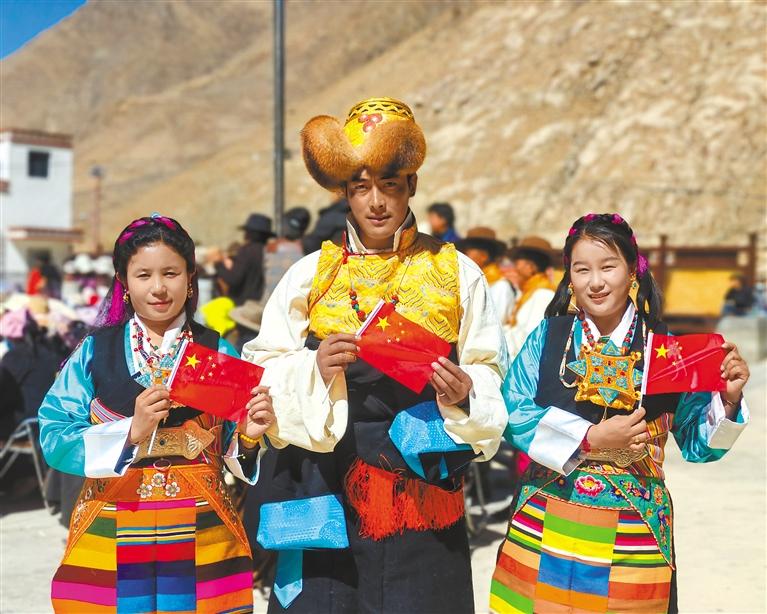3月28日上午,日喀则市四号公园内人头攒动,热闹非凡。10时整,升旗仪式正式开始。国旗护卫队迈着坚定有力的步伐护送国旗至升旗台,在雄壮的《义勇军进行曲》中,五星红旗冉冉升起、迎风飘扬,广大干部群众面向国旗肃立、齐唱国歌。随后,大家与陈列于广场一侧的天安门广场国旗合影留念,这面国旗是2024年7月天安门地区管理委员会赠予日喀则市的,曾于西藏和平解放72周年纪念日当天在天安门广场升起,具有特殊的纪念意义。公园里还举办了群众性广场舞(锅庄)启动仪式暨展演活动,来自全市各县区的2000余名干部群众身着传统民族服饰,载歌载舞共庆这一节日。