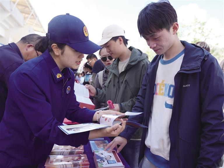 “今年的全国防灾减灾宣传日主题是什么?”“身边常见的消防安全隐患有哪些?会带来什么样的风险?”“远离火灾现场时,如果楼梯、走廊内烟雾多,呛人怎么办?”“电动自行车引发火灾的常见原因包括哪些?”在活动现场,讲师团成员从“消防安全隐患”“电动自行车火灾”“初起火灾扑救和应急处置”等方面设置了有奖问答题目,同时准备了精美的消防宣传礼品和校园消防安全知识手册,吸引了不少师生参与。