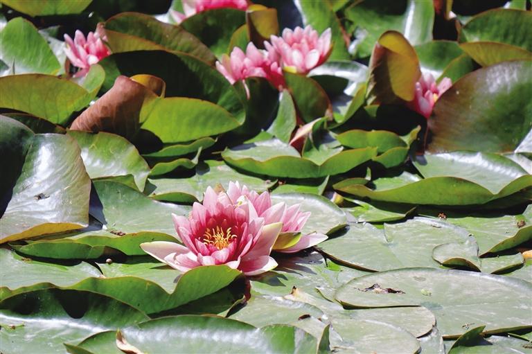 “移舟水溅差差绿,倚栏风摇柄柄香。”走进柳梧国际总部城院内,在停车场的东侧,一池莲花在层层莲叶的衬托下开得正盛。走近池边,莲叶特殊的淡淡香味夹杂着潮湿的水汽扑面而来。粉、白的莲花在几场雨过后,迎着阳光依次绽放。几个孩子在池边嬉戏追逐,时不时用手挑起水花四溅,远远看去,颇有“小姑贪戏采莲迟”的意味。