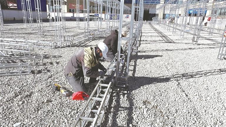 工人正在搭建促销活动场地。记者 谭瑞华 摄