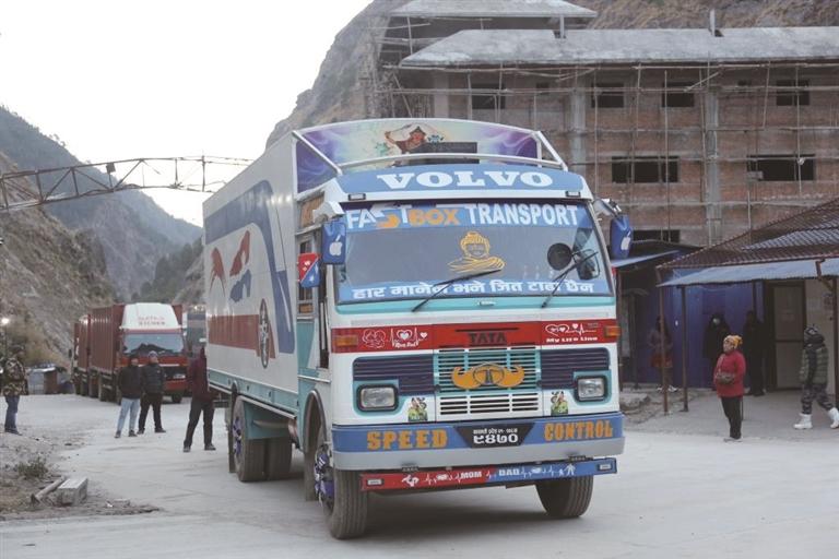 2026年1月1日,在尼泊尔热索瓦口岸,一辆卡车等待通过热索临时便桥进入中国吉隆口岸。新华社记者 张平 摄