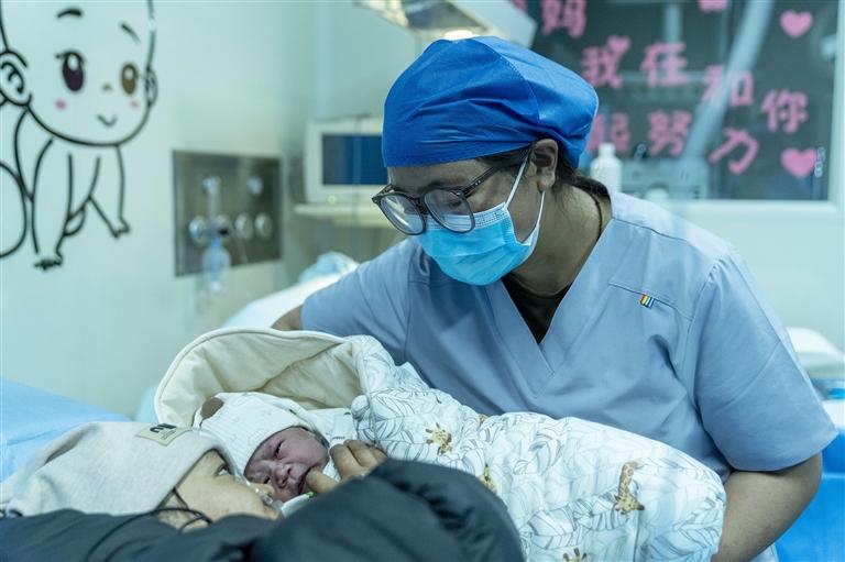 2026年1月1日,西藏自治区人民医院妇产科助产医生次拉(右)让孩子母亲旦增曲珍抚摸新生儿。 新华社记者 旦增尼玛曲珠 摄