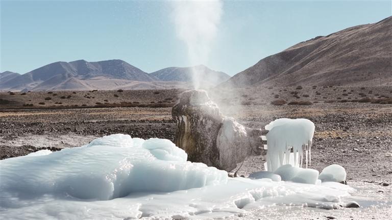 冬季是观赏朗久地热的绝佳季节。滚烫的热水(水温可达85摄氏度以上)喷涌而出,遇到零下二三十度的严寒空气,瞬间凝结成冰。热水还在继续喷涌,冰层却在不断加厚,形成巨大的冰柱、冰幔,在荒芜的高原上散发着魔幻的色彩,宛如外星秘境。据了解,朗久地热属于高温地热资源,富含多种矿物质。