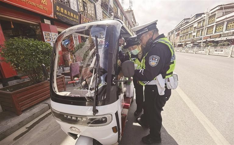 “您好,请出示驾驶证和行驶证。”“谢谢配合,注意骑行安全。”4月2日16时许,记者来到北京东路路段,此时道路上人车流量较大,交通十分繁忙,由拉萨市交通运输综合行政执法队、拉萨市公安局交通管理支队、拉萨市公安局旅游警察支队组成的联合执法队,各部门执法人员分工协作、密切配合,在路段设置临时检查点,对过往的电动三轮车进行逐一检查。