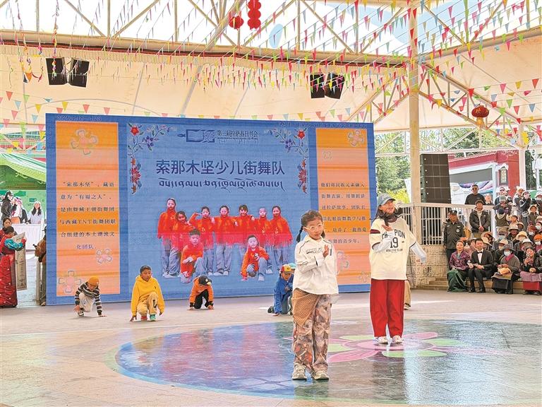 左图:第三届“拉萨春日书会”暨拉萨市全民阅读推广周系列活动开幕式现场的少儿街舞表演。
