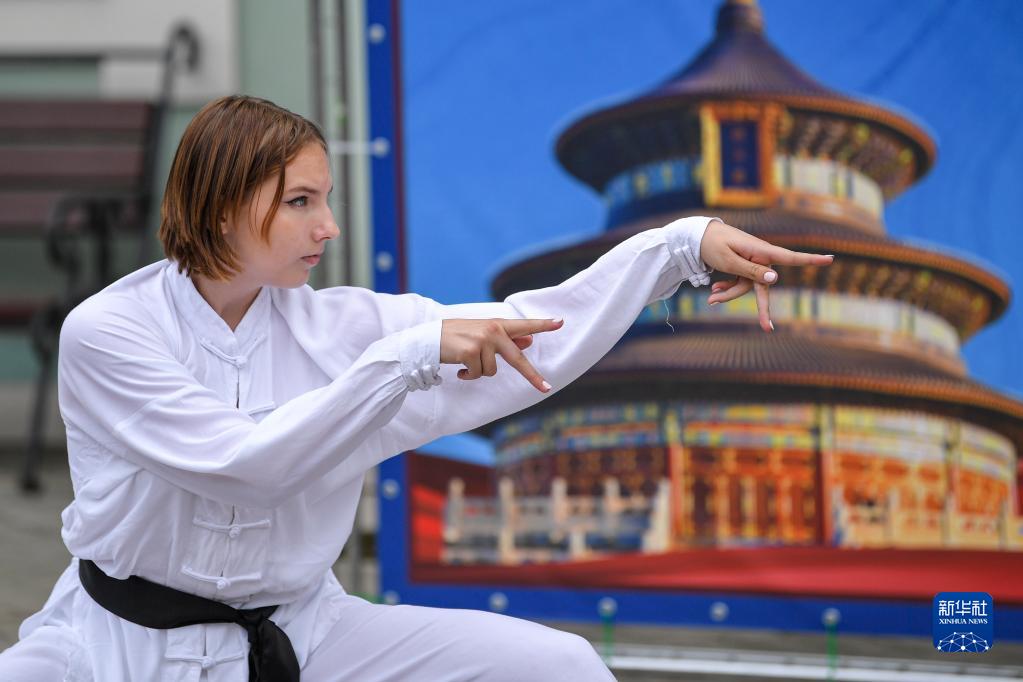 2022年7月14日,在俄罗斯莫斯科,武术爱好者在第二届莫斯科“孔子杯”中国体育与文化艺术项目大赛活动中表演武术。