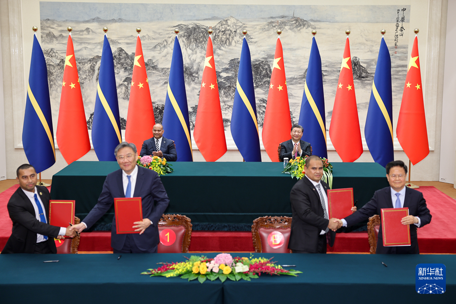3月25日下午,国家主席习近平在北京人民大会堂同来华进行国事访问的瑙鲁总统阿迪昂举行会谈。这是会谈后,两国元首共同见证签署共建“一带一路”、落实全球发展倡议、经济发展、农业等领域多项双边合作文件。