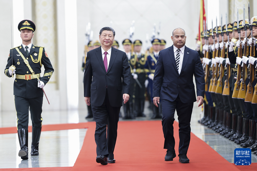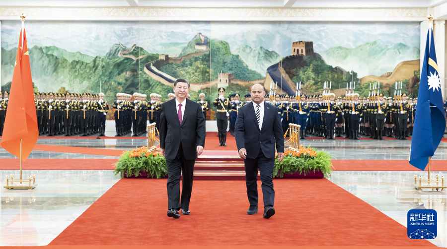 3月25日下午,国家主席习近平在北京人民大会堂同来华进行国事访问的瑙鲁总统阿迪昂举行会谈。这是会谈前,习近平在人民大会堂北大厅为阿迪昂举行欢迎仪式。新华社记者 黄敬文 摄
