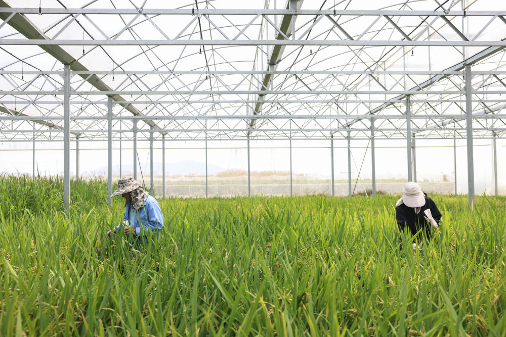 2025年3月21日,工作人员在海南三亚国家南繁科研育种基地收种。新华社记者 张丽芸 摄