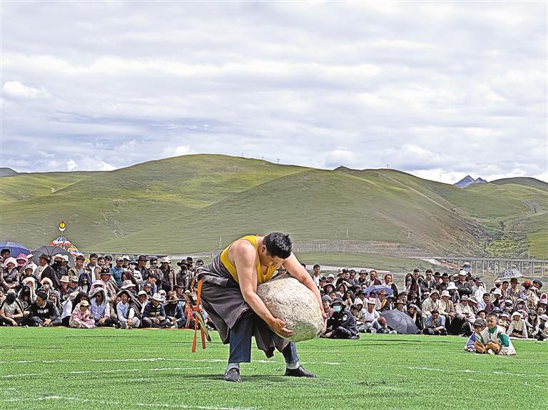 在赛马场的另一边,“抱石头”比赛同样振奋人心。抱石头比赛藏语称之为“朵加”,是藏族传统体育项目。比赛中,现场选手们背举、起身动作娴熟,持续负重能力强,演绎了一场对力量的崇尚,还有智慧的较量。