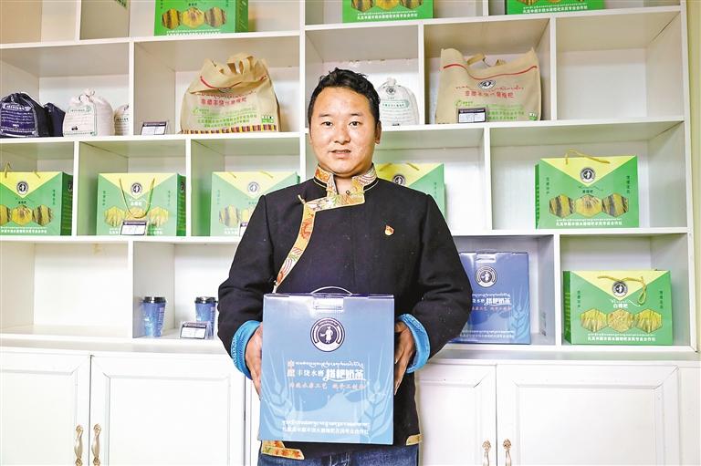 申藏村村民委员会副主任、乡村振兴专干久米旺久展示扎其申藏丰饶水磨糌粑合作社的产品。本报记者 顿珠扎西 摄
