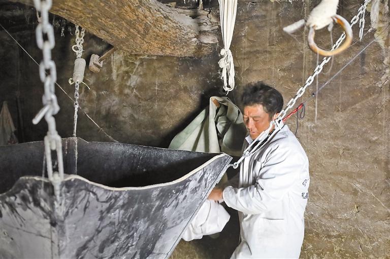 村民往水磨坊里倒入青稞。 本报记者 顿珠扎西 摄