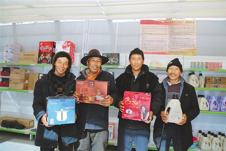 图为墨竹工卡县扎西岗乡斯布村群众在积分兑换超市领取物品。