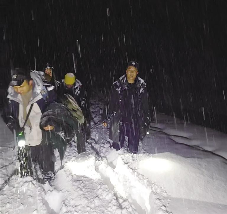 尽管如此,搜救人员没有放弃。他们一边缓慢前行,一边大声呼喊失联人员的名字。尽管声音在呼啸的风雪中显得微弱,但他们始终坚持。即便体力透支、鞋底结冰、衣服浸湿、脸颊被冻伤,也无人停下脚步。