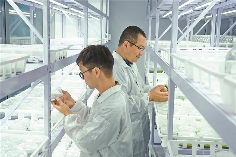 图为基地工作人员正在检查组织培养瓶里植物的长势。