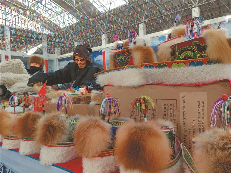 图为那曲市安多县牧民在整理销售天线帽工艺品。本报记者 赵书彬 摄