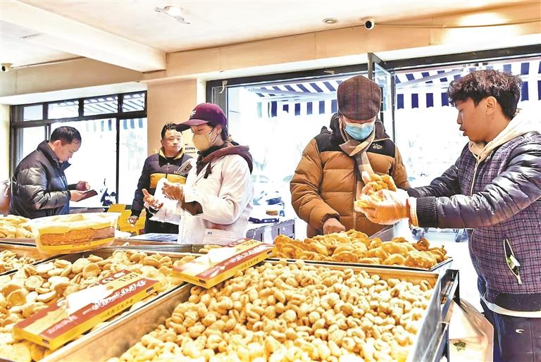 作为拉萨市民熟知的年货采购地,八廓商城已连续多年举办年货节。2026年的年货节以免费摊位为契机,以丰富年货为载体,将消费者与商户紧密联结在一起。商城对240个摊位进行了精细化划分,依据商品种类设置对联、羊头、酥油花、青稞草、糖果、坚果等专区,从一楼到三楼有序分布,形成一条琳琅满目的年货 “长廊”,让市民能快速找到心仪商品。