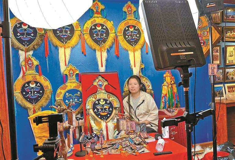 达孜区雪乡阿古传统藏戏服饰农牧民专业合作社员工通过网络直播,拓宽藏戏服饰销售渠道。