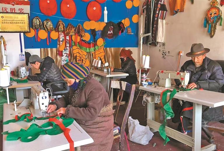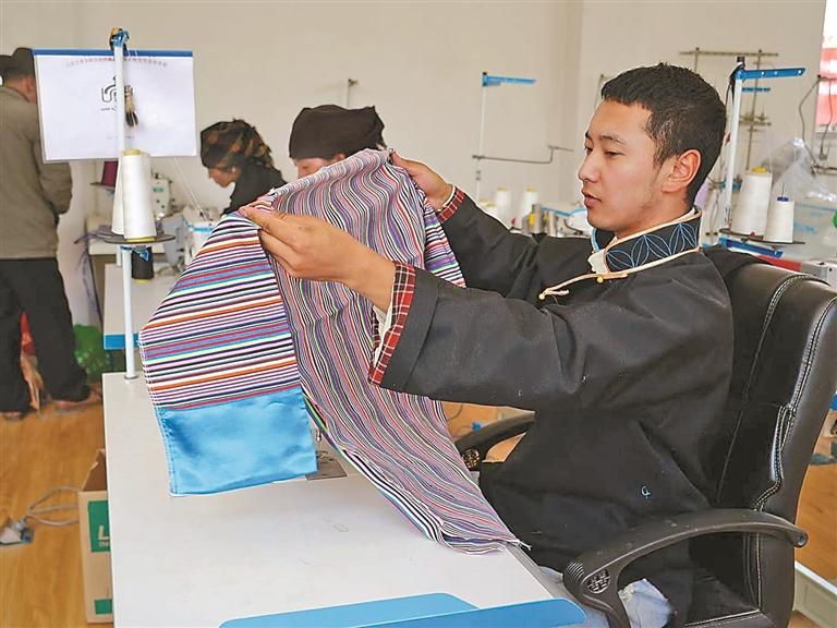 技艺的创新与市场的拓展,也为家乡的农牧民群众带来了实实在在的收益。始终心系群众的米玛坚才,系统培训了18名农牧民,使他们从零基础慢慢成长为熟练掌握藏戏服饰制作技艺的手工艺人,不用背井离乡就能在家门口挣钱。“以前靠种地过日子,收入不稳定,现在在合作社有固定收入,一年下来能挣3万多元,顾家挣钱两不误,特别知足。”合作社的农牧民员工谈起这份工作,脸上满是笑意。