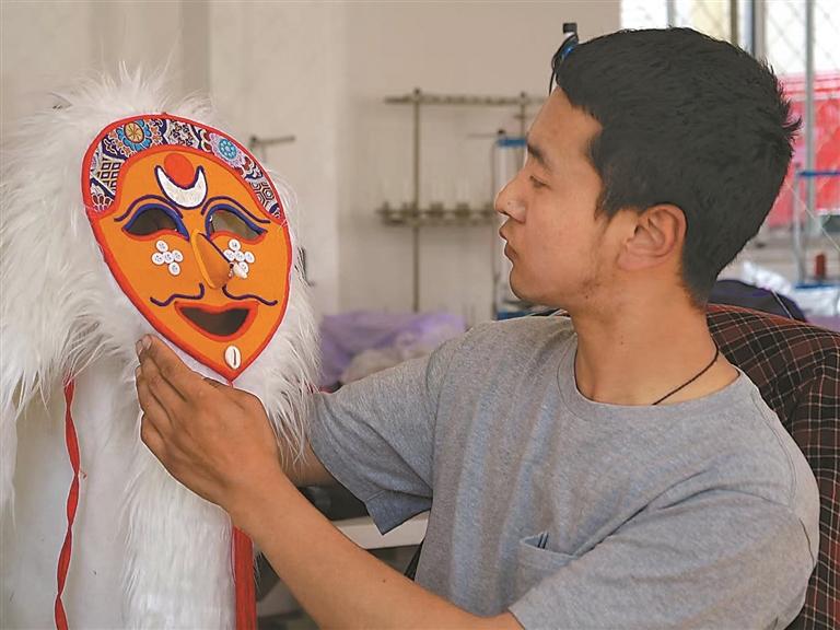 米玛坚才在仔细端详刚制作的藏戏面具。