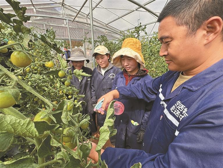 图为贡觉县现代农业产业园的技术员向当地就业青年教授小番茄种植技术。本报记者 白玛泽旺 次仁平措 摄
