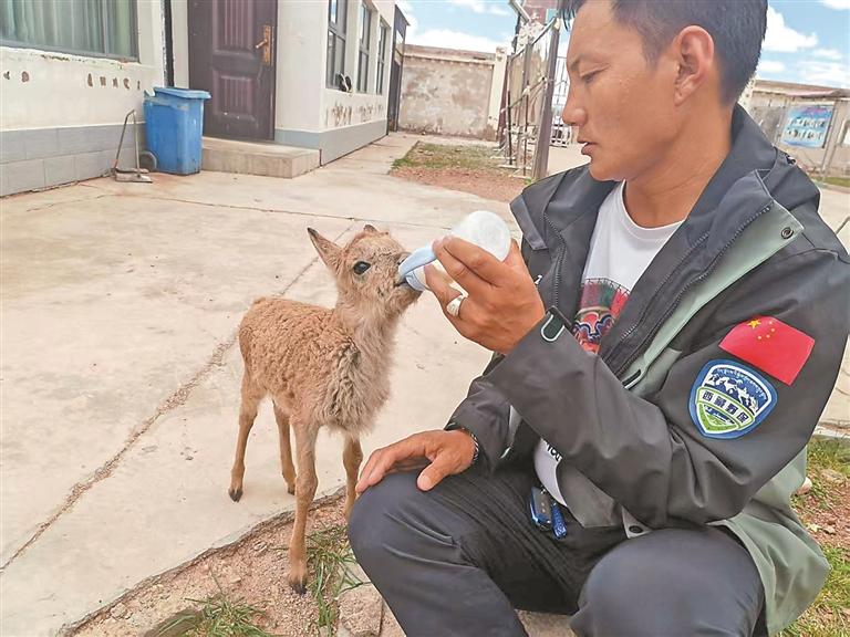 那天,萨太尔管护站的管护员扎西平措、曲珠、扎西次仁、次穷、扎多,像往常一样在辖区巡护。在一处草原沟壑区内,一幕让人揪心的画面映入眼帘:一只刚出生不久的藏羚羊幼崽,正蜷缩在沟壑中,浑身绒毛湿漉漉的,4条纤细的小腿止不住地颤抖,黑亮的眼眸里满是恐惧和无助,一声声微弱的鸣叫,像是在呼唤失散的母亲。“快,把它抱起来!这里野狼和秃鹫多,晚一步就危险了!”扎西平措脱下身上的管护服,裹住瑟瑟发抖的藏羚羊幼崽,将它带回管护站。