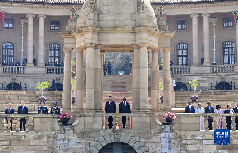 8月的比勒陀利亚,晴空万里,惠风和畅。总统府广场鲜花盛开,中南两国国旗迎风飘扬。在总统摩托车队护卫下,习近平乘车抵达总统府,拉马福萨在下车处热情迎接。两国元首登上检阅台。仪仗队行持枪礼,军乐队奏中南两国国歌,现场鸣放21响礼炮。习近平检阅南非仪仗队。两国元首同双方陪同人员一一握手。