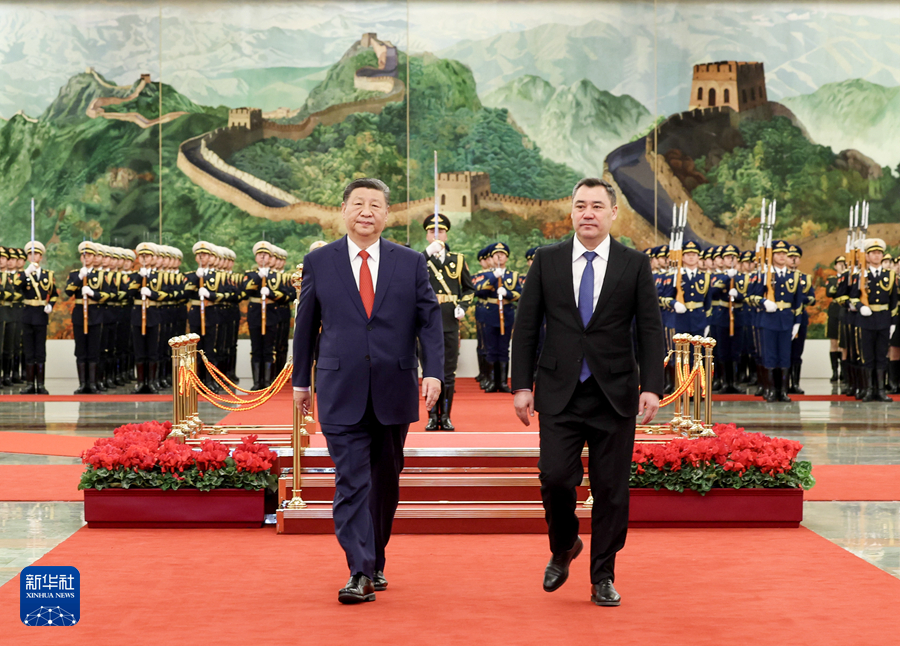 2月5日上午,国家主席习近平在北京人民大会堂同来华进行国事访问的吉尔吉斯斯坦总统扎帕罗夫举行会谈。这是会谈前,习近平在人民大会堂北大厅为扎帕罗夫举行欢迎仪式。新华社记者 李响 摄