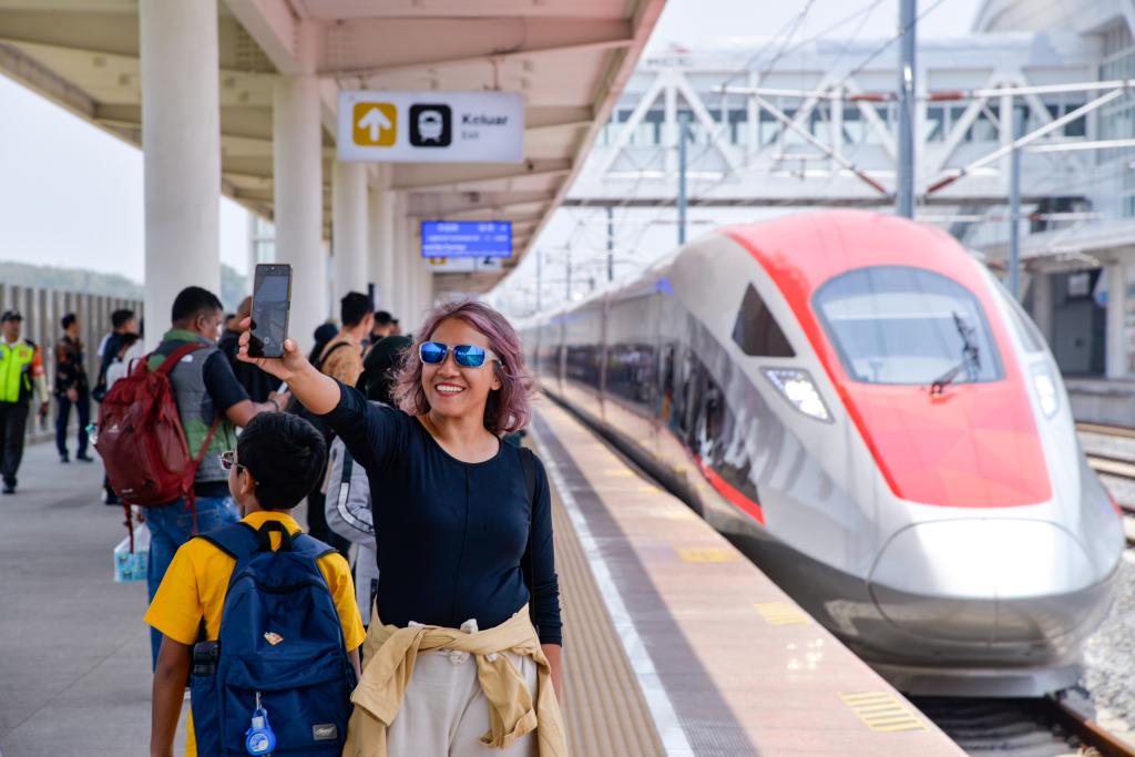 10月17日,在印度尼西亚帕达拉朗站,乘客在雅万高铁高速动车组前自拍。新华社记者 徐钦 摄