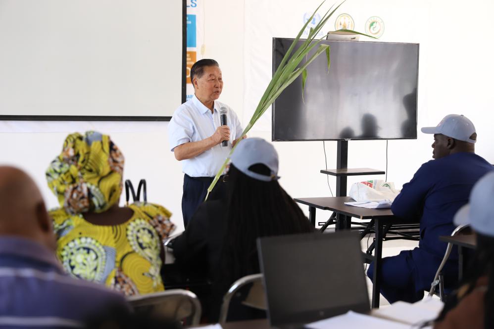 8月4日,在位于卢旺达南方省胡耶区的中国援卢农业技术示范中心,菌草发明人林占熺为培训班学员讲解菌草技术。新华社发(黄万晴摄)
