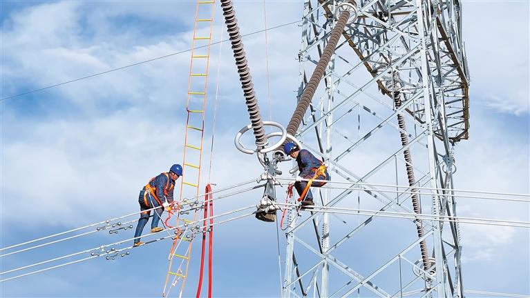 工作人员在那曲市色尼区罗玛镇±400千伏柴拉直流#1889杆塔开展绝缘护套安装工作