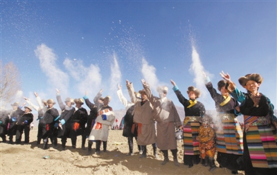拉萨市城关区蔡公堂乡白定村4组农民们在春耕仪式开始时向天空抛撒糌粑,祈愿国泰民安,庄稼丰收。