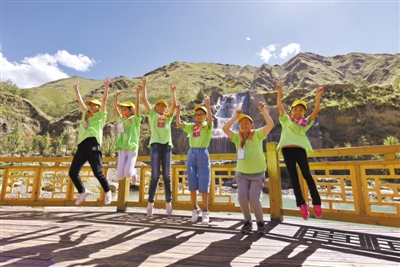 来自全区各地参加“红领巾动感假日——各族少年手拉手”夏令营的少先队员们正在拉萨市南山公园内拍照留念。