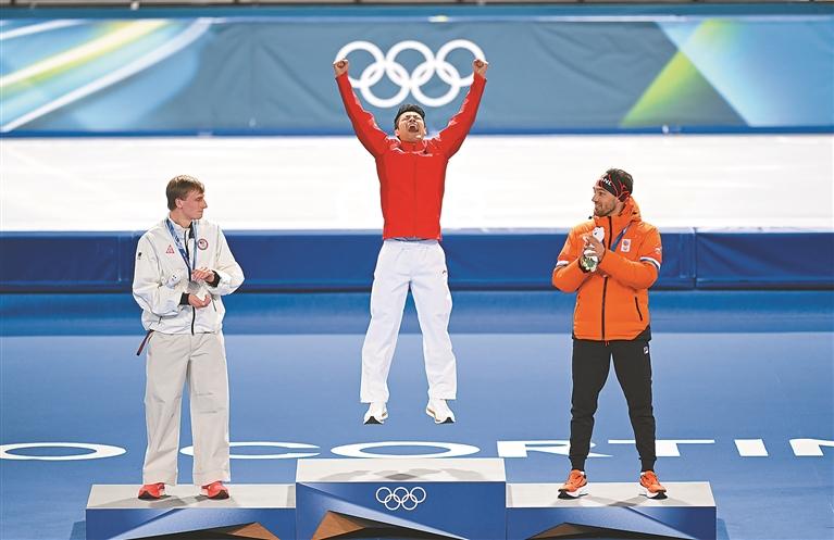 确认自己获胜后,宁忠岩泪洒赛场,他身披五星红旗缓缓绕场滑行庆祝,观众纷纷起身为他欢呼、鼓掌。“这个成绩对我来说非常、非常满意。我的目标是打开(1分)43秒,但我真没想到自己能滑进(1分)42秒。”他说。