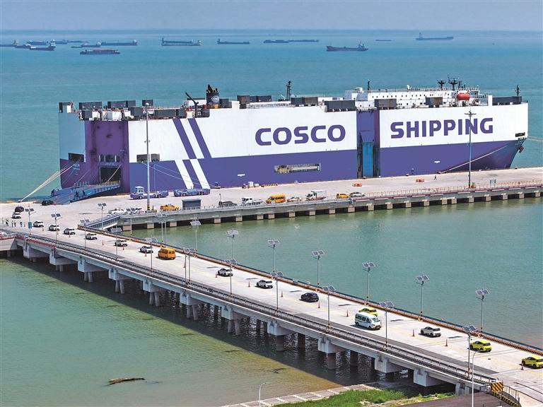 图为在江苏太仓港,装载3600余辆商品车的“玉衡先锋”号即将启程前往东南亚(2025年9月16日摄,无人机照片)。 新华社记者 李博 摄