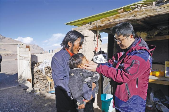 4月27日,在噶尔县牧民家,王克明医生(右一)查看患儿恢复情况。