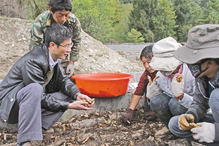 广东省第七批援藏工作队成员肖国鑫(左一)在波密县指导当地农牧民种植天麻。
