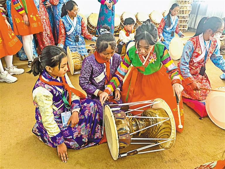 在“吉藏一家亲”冬令营活动中,日喀则学生在朝鲜族学生指导下学习打鼓。