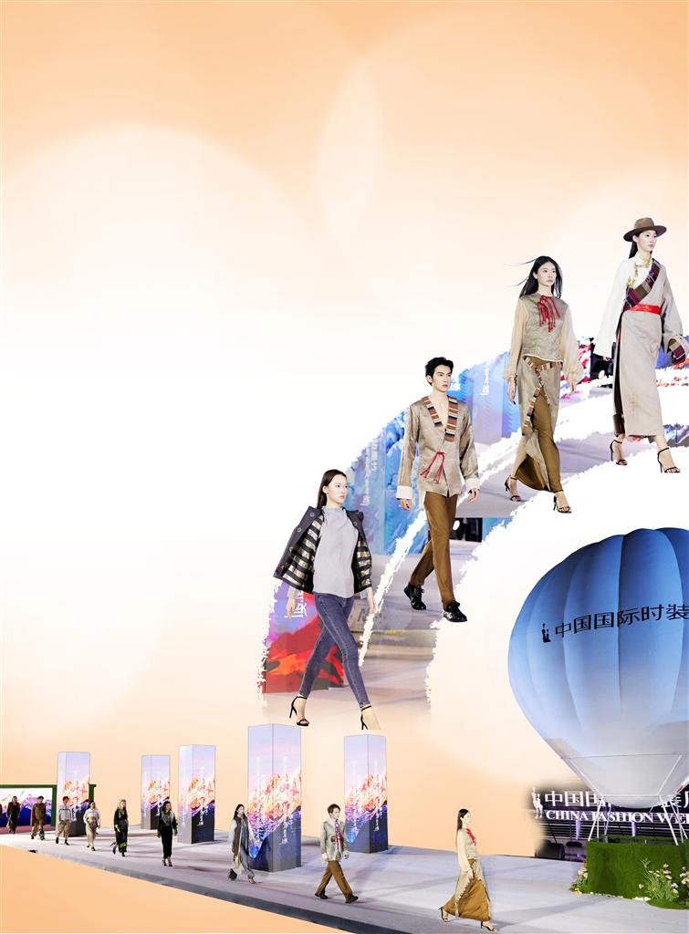 模特们身着融合藏族传统元素与现代剪裁的新式藏装走秀。