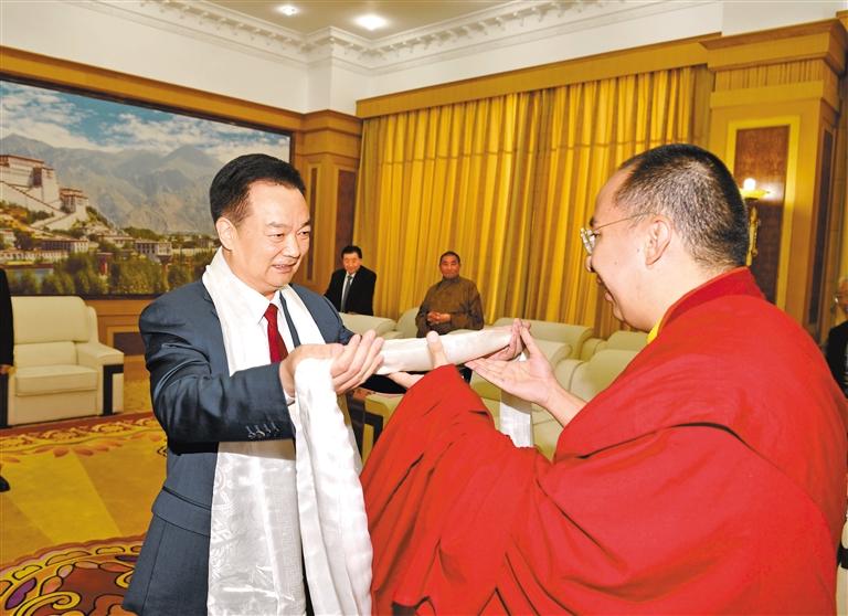 近日,自治区党委书记王君正在拉萨会见班禅额尔德尼·确吉杰布。这是王君正与班禅额尔德尼·确吉杰布互献哈达。
