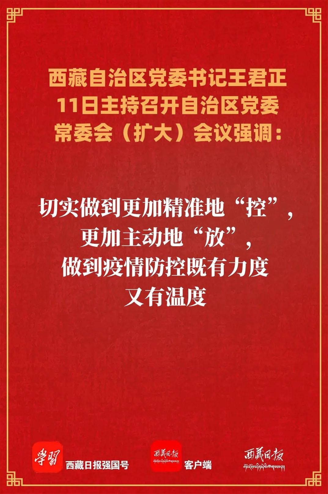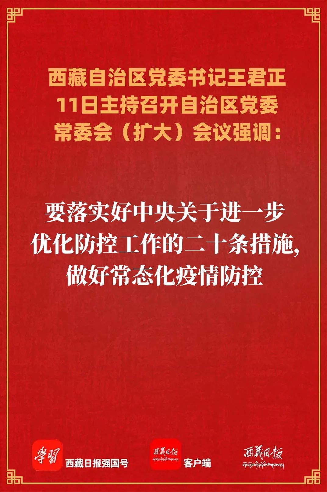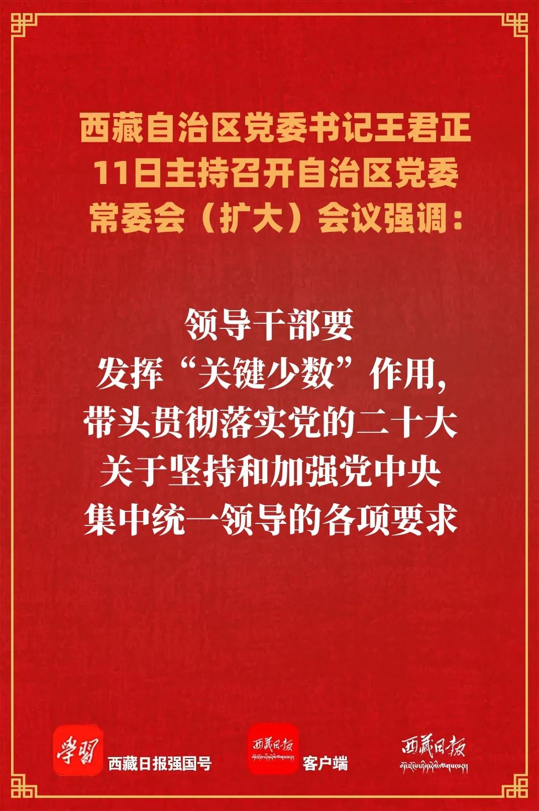 会议传达学习了《中共中央政治局关于加强和维护党中央集中统一领导的若干规定》《中共中央政治局贯彻落实中央八项规定实施细则》等文件精神,研究我区贯彻落实意见。王君正强调,党中央集中统一领导是党的领导的最高原则,加强和维护党中央集中统一领导是全党共同的政治责任。领导干部要发挥“关键少数”作用,带头贯彻落实党的二十大关于坚持和加强党中央集中统一领导的各项要求,深刻领悟“两个确立”的决定性意义,不断提高政治判断力、政治领悟力、政治执行力,坚定不移维护以习近平同志为核心的党中央权威和集中统一领导,坚定不移把“两个确立”转化为坚决做到“两个维护”的思想自觉、政治自觉、行动自觉。要带头严格遵守党的政治纪律和政治规矩,全面贯彻习近平新时代中国特色社会主义思想,自觉同党的理论和路线方针政策对标对表,始终做到党中央提倡的坚决响应、党中央决定的坚决照办、党中央禁止的坚决不做,确保令行禁止、政令畅通,确保党中央决策部署在西藏得到坚决贯彻落实。要带头严格遵守党章和党内政治生活准则,认真落实民主集中制,经常开展批评与自我批评,真正做到决策科学民主、执行坚决有力、办事合法高效。要带头严格遵守反分裂斗争纪律,树牢总体国家安全观,发扬斗争精神,增强斗争本领,在维护祖国统一、加强民族团结、反对分裂等重大政治原则问题上,始终做到旗帜鲜明、立场坚定,态度坚决、步调一致,坚决维护国家安全、社会稳定。