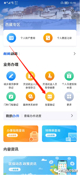 2.5点击如下图位置“生育登记”即可进行生育保险待遇领取申请