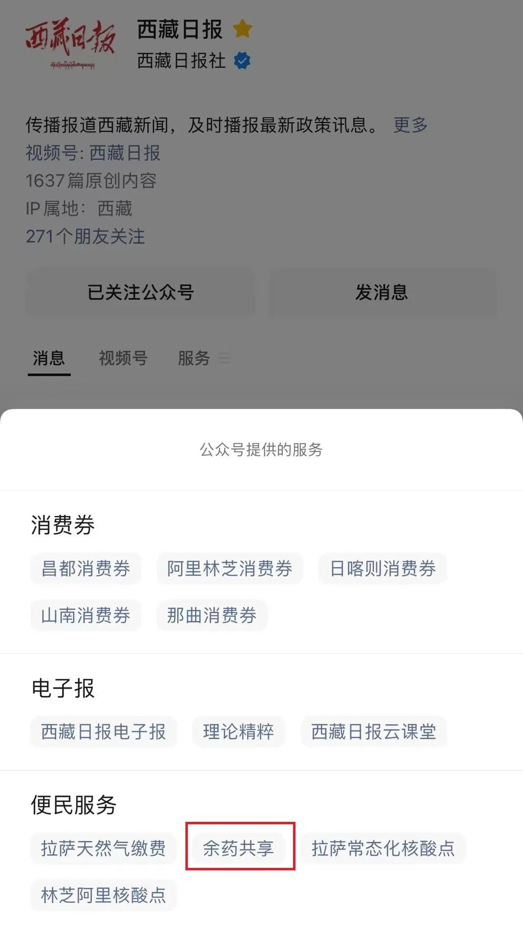 第一步:关注、进入“西藏日报”微信公众号,点击“服务”进入菜单栏。