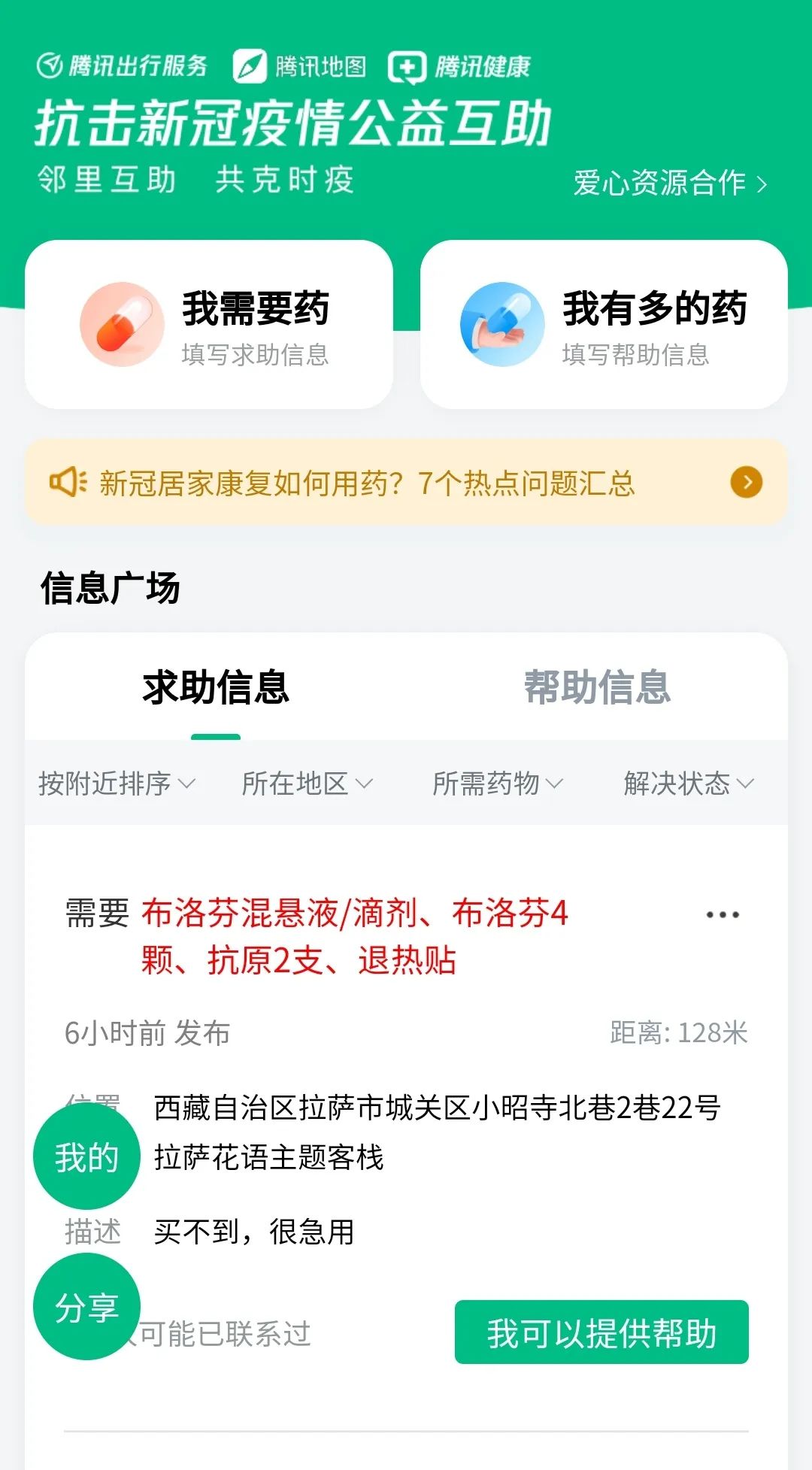 假如你可以为当中的“求助者”提供服务,只需点击信息下方的“我可以提供帮助”,通过页面的实名认证后,就能看到“求助者”留下的微信号/手机号码,通过微信号/手机号码,跟对方联系,再利用外卖跑腿等方式,将对方需要的药物、抗原送给对方。记者留意到,在页面的“信息广场”中已经有许多人收到了自己需要的药品。