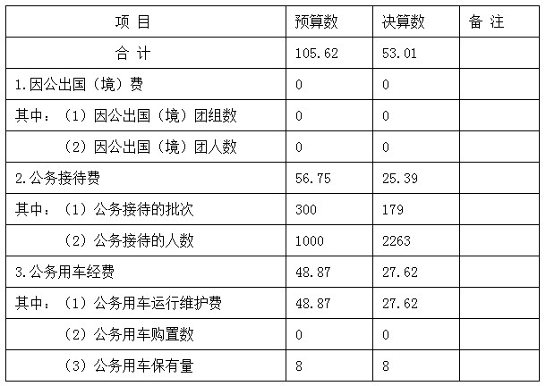 1.2019年“三公”经费支出总额53.01万元,“三公”经费年初预算安排105.62万元,完成预算的50.19%,比2018年减少6.01万元,下降1018%,其中:公务接待费25.39万元,比2018年减少5.59万元,公务用车运行维护费27.62万元,比2018年减少0.42万元。接待人次同比下降32.89%,公务接待经费同比下降18.04%。“三公”经费支出持续实现零增长。“三公”经费较上年下降的主要原因:一是2019年公务接待人次明显减少,公务接待支出和公务用车运行支出相应减少;二是我办加强“三公”经费管理,严格遵守中央八项规定和自治区党委“约法十章”“九项要求”,对公务接待范围、标准、审批等方面作出了明确规定。严格坚持“两清单一报告”,每次接待有人员清单,接待处每月对里程清单和人员清单进行汇总对比,并向办事处领导汇报制度,严格控制公务接待支出,公务接待在西藏大厦定点用餐,严格控制用餐标准。严格公务用车管理,实行油卡管理和定点维修保养,进一步降低公务用车运行成本。