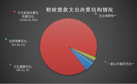 2021年财政拨款实际支出12168.49万元,其中:一般公共服务支出474.96万元,占实际支出3.9%;文化旅游体育与传媒支出11096.44万元,占实际支出91.18%;社会保障和就业支出245.41万元,占实际支出2.02%;卫生健康支出160.21万元,占实际支出1.31%;住房保障支出191.46万元,占实际支出1.57%;